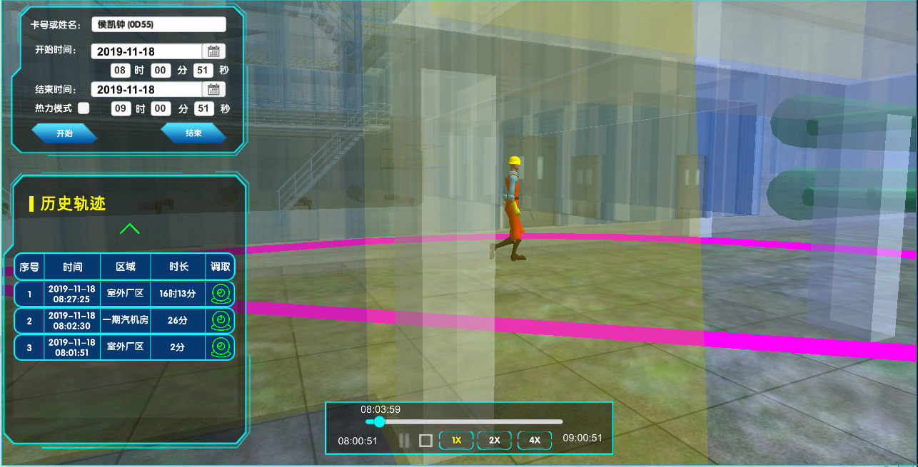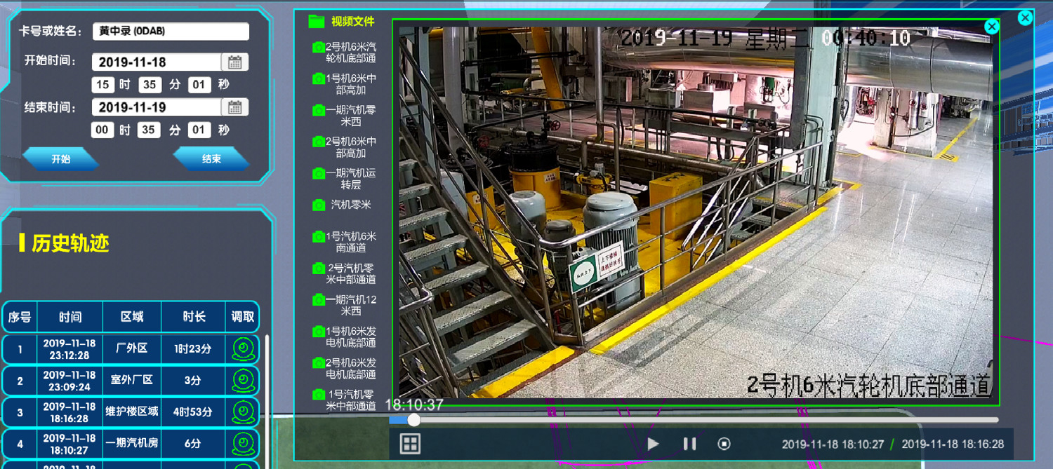 系統(tǒng)支持接入電廠視頻監(jiān)控系統(tǒng),在三維電子地圖上顯示視頻監(jiān)控位置,任意切換調(diào)取視頻監(jiān)控。可實現(xiàn)快速查找、單點回放、圖像識別等功能。同時可基于人員當(dāng)前位置自動調(diào)取對應(yīng)的視頻監(jiān)控,對人員行走到其他位置自動切換到相應(yīng)監(jiān)控畫面。對于發(fā)生異常的情況,可基于人員歷史軌跡不同位置及不同時段調(diào)取相應(yīng)位置相應(yīng)時間段的歷史視頻監(jiān)控,與歷史軌跡聯(lián)動播放,方便事故分析及責(zé)任劃定。