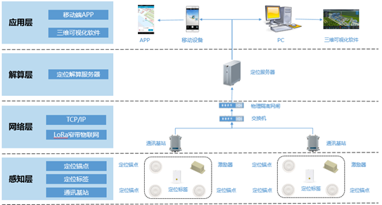 感知層:包括定位標(biāo)簽、定位錨點(diǎn)、激勵(lì)器。定位標(biāo)簽和定位錨點(diǎn)之間通過UWB信道實(shí)時(shí)測(cè)距,測(cè)距信息通過LoRa 2.4G無線網(wǎng)絡(luò)上傳到通訊基站。