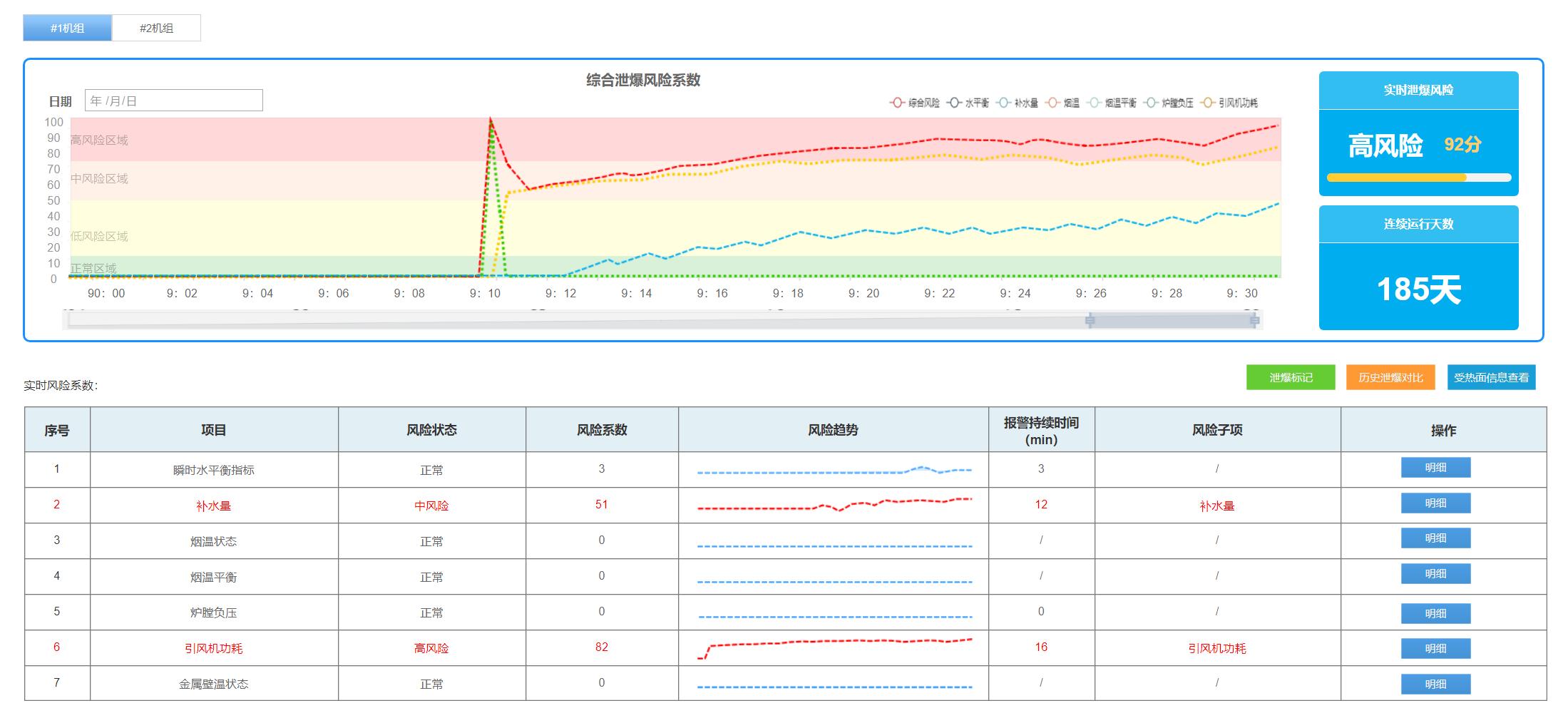 以系統(tǒng)的某電廠實(shí)際案例示例,該電廠防磨防爆可視化管理系統(tǒng)泄爆風(fēng)險(xiǎn)監(jiān)控頁面顯示,1號(hào)鍋爐在上午9:10膛負(fù)壓指標(biāo)、綜合風(fēng)險(xiǎn)指標(biāo)突然上升,隨后爐膛負(fù)壓風(fēng)險(xiǎn)指標(biāo)逐漸下降,同時(shí)引風(fēng)機(jī)功耗、水平衡指標(biāo)先后逐漸升高。點(diǎn)擊相關(guān)異常項(xiàng)目,分析風(fēng)險(xiǎn)指標(biāo)的發(fā)展曲線以及歷史數(shù)據(jù)偏離特征后,初步判定為鍋爐爐膛水冷壁可能存在泄爆,立刻協(xié)調(diào)人員進(jìn)行現(xiàn)場(chǎng)勘查。