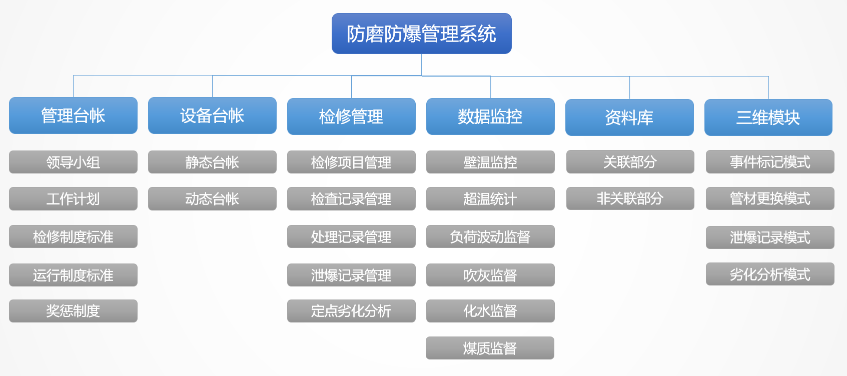 我國(guó)火力發(fā)電廠(chǎng)各種事故中,鍋爐事故約占發(fā)電廠(chǎng)總事故的70%以上,而過(guò)熱器、再熱器、省煤器、水冷壁四類(lèi)管(簡(jiǎn)稱(chēng)“四管”)泄漏與爆破事故時(shí)有發(fā)生,在眾多事故中出現(xiàn)較多,約占鍋爐總事故的70%以上,成為困擾火力發(fā)電廠(chǎng)安全生產(chǎn)的一大難題。針對(duì)這一問(wèn)題,云酷科技設(shè)計(jì)了防磨防爆可視化管理系統(tǒng)。